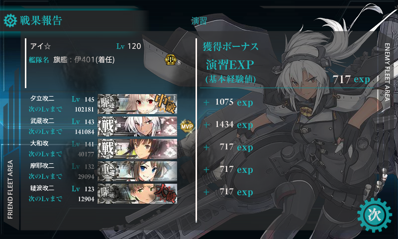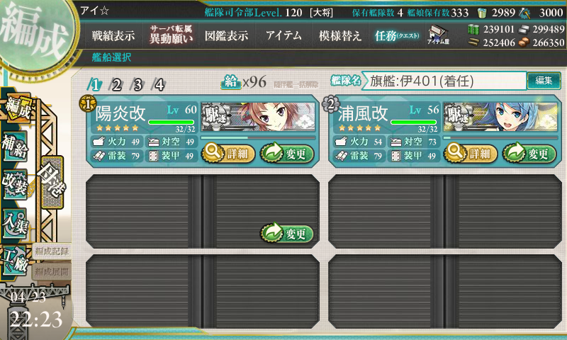 陽炎さまは遠征部隊に入れて、地味に経験値積ませていたのですが、間に合わず、浦風さまも好きな子ではあったけど、最近の改造ラッシュ(霰さまとか、磯風さまとか・・・)で、全然間に合ってないですね。ちょっと最近、改造のための育成に追われちゃった感じがあります。