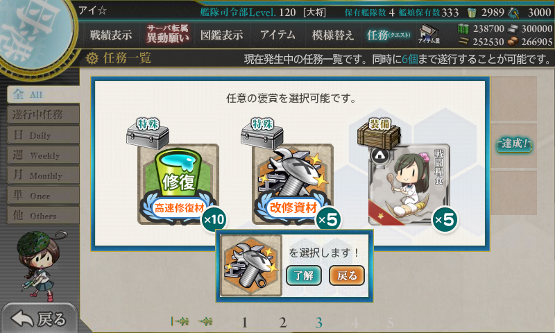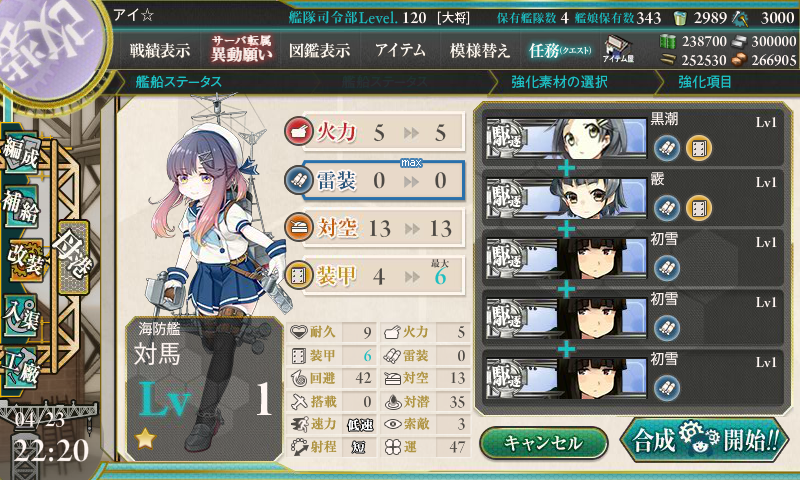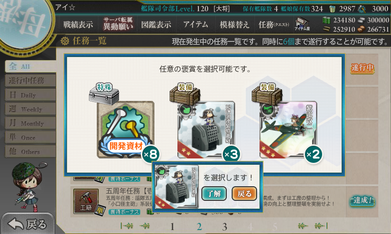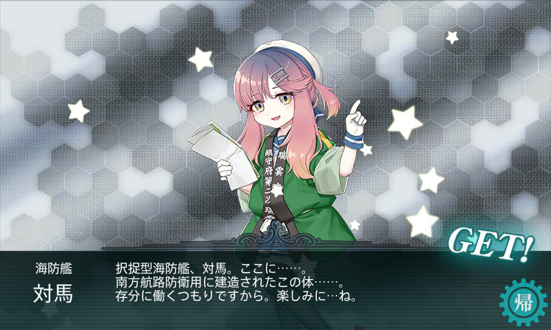 Getなのですが、ここで慌てて、対馬さまを改修するとハマるのが、この任務群の怖い所で、次の五周年任務【参:近代化改修】で使うのですよね。で、駆逐艦5人を改修で使って海防艦の改修に2回成功するためには